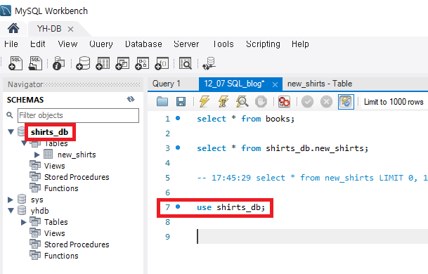 위의 그림을 보면 호출한 테이블은 shirts_db에 있는데 작업 중인 스키마는 yhdb이기에